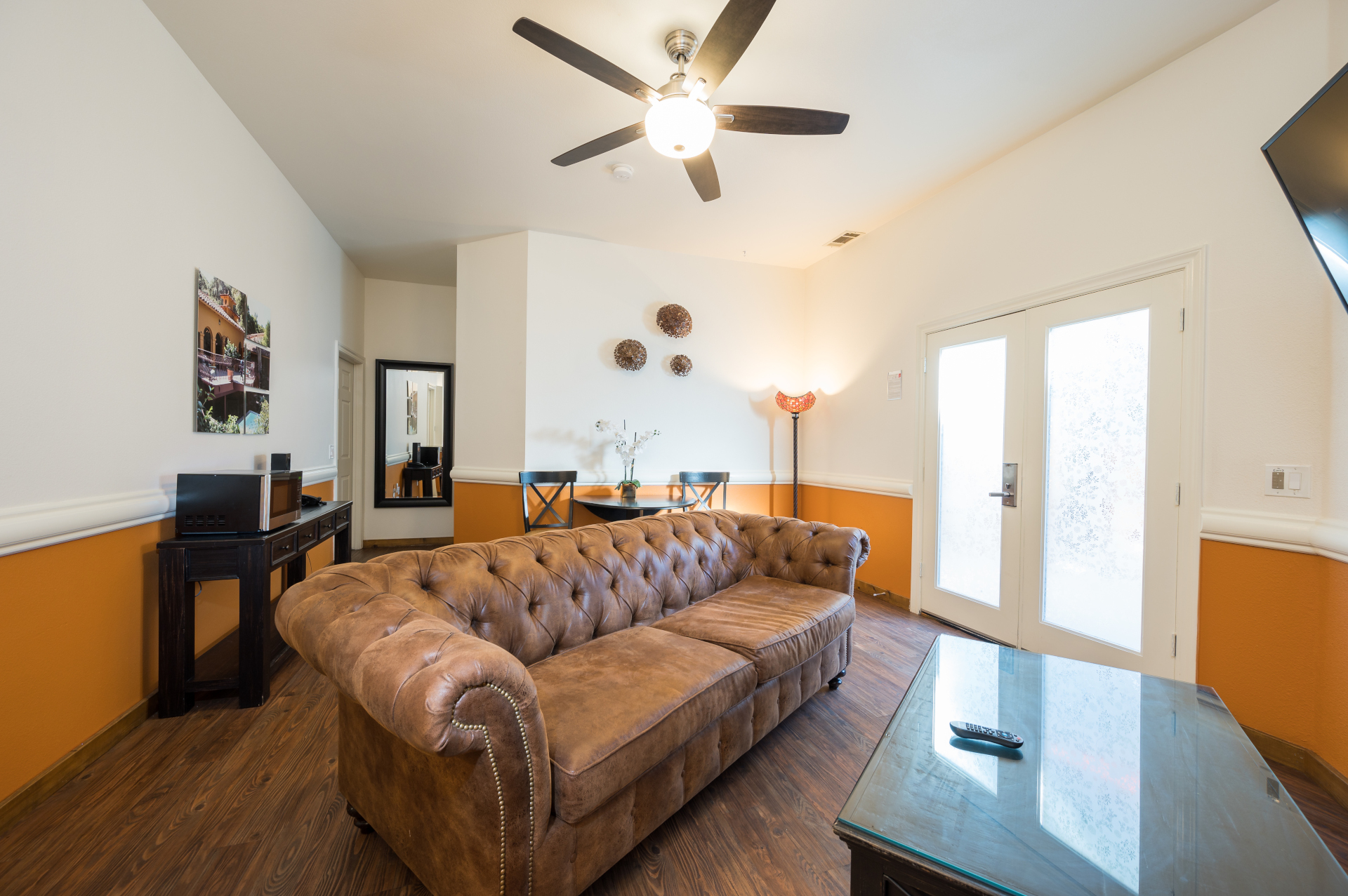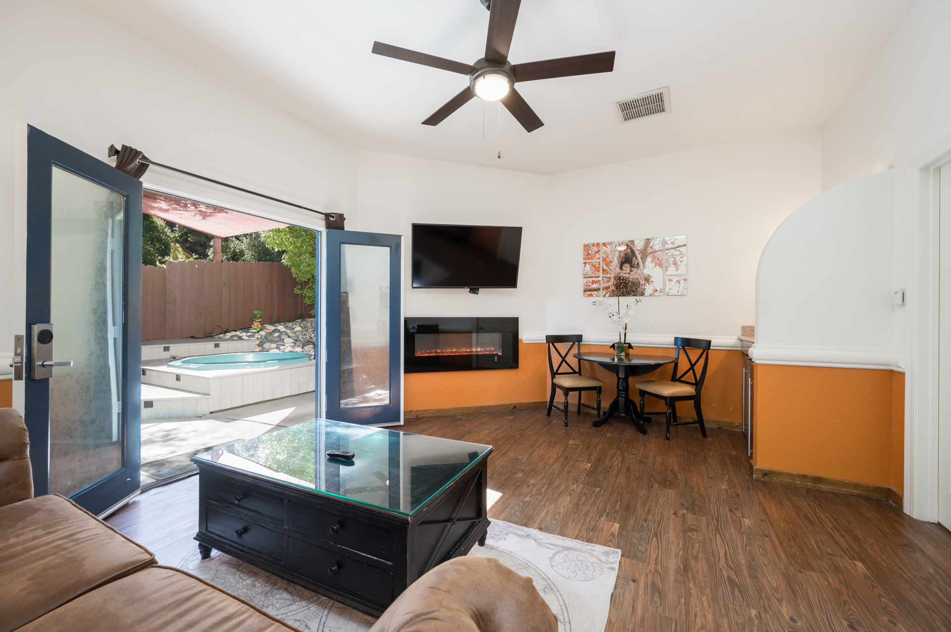 - Double doors that open to the large patio area