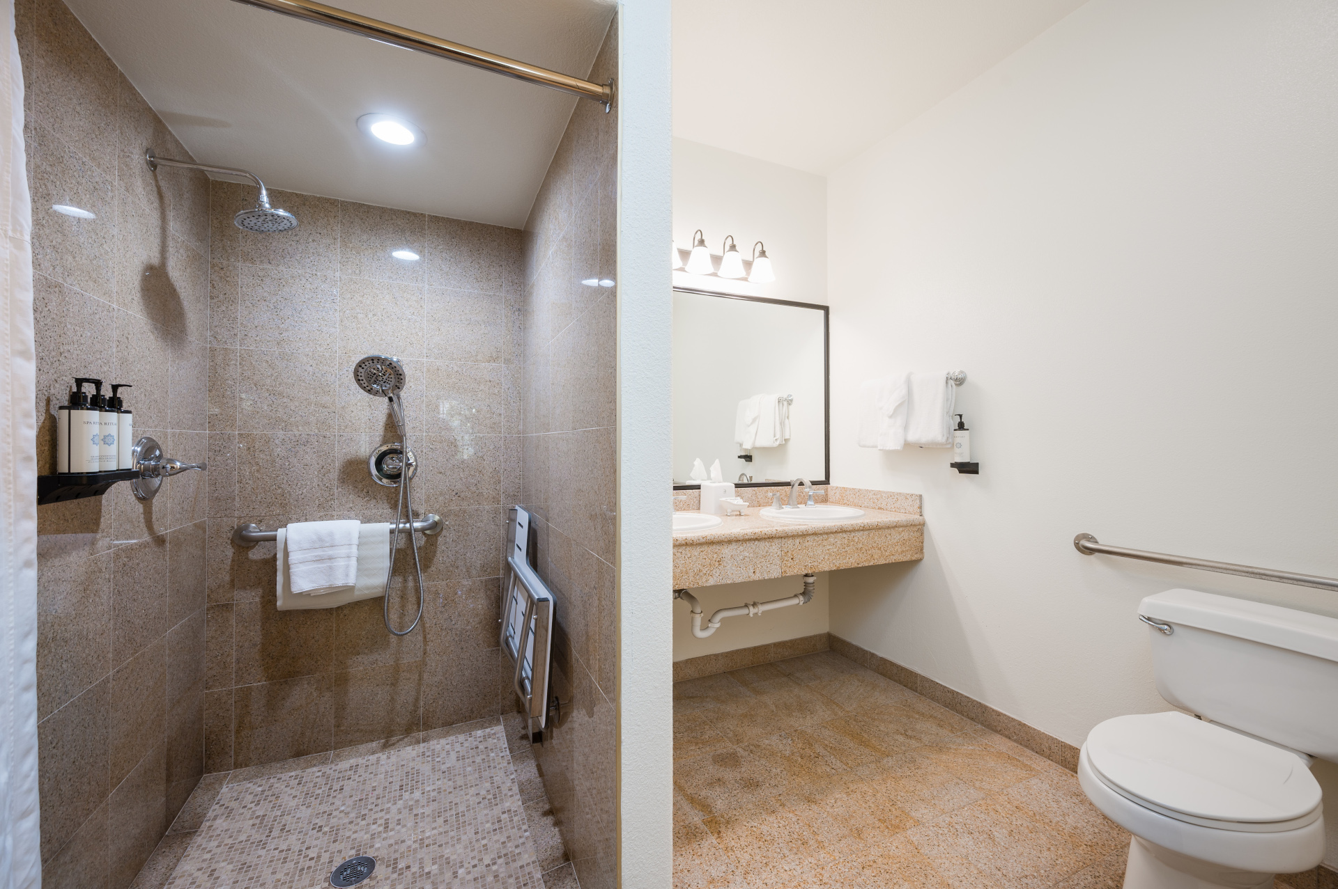 - 1 ADA Accessible Bathroom with a zero-threshold shower, handrails, and a built-in seat