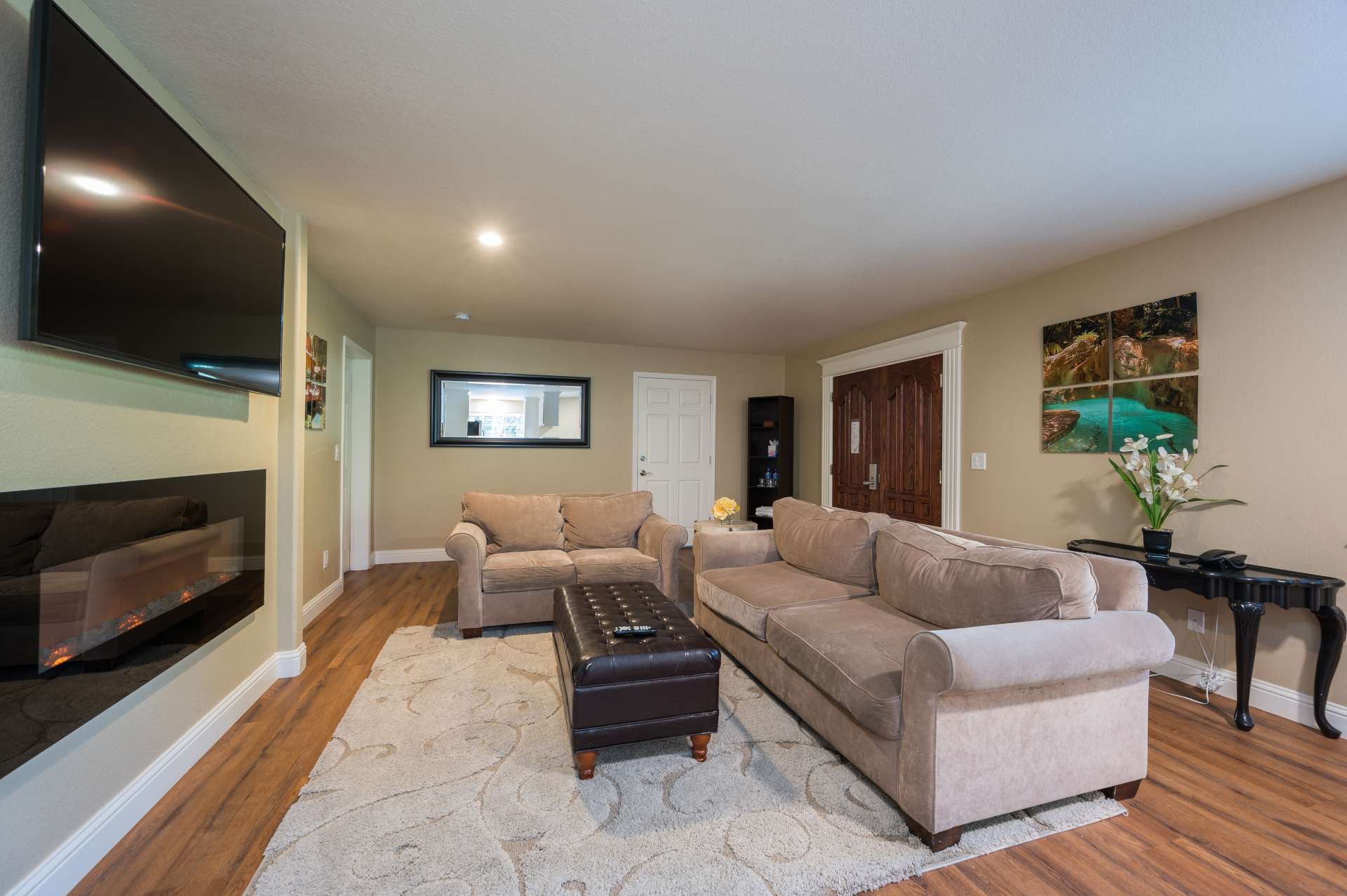 - Living Area with 1 queen sleeper sofa, electric fireplace, and flat screen TV